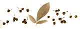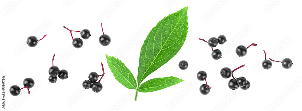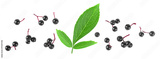 Ripe black elderberries with green leaves isolated on a white background, top view. Sambucus berries.