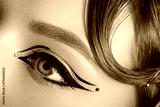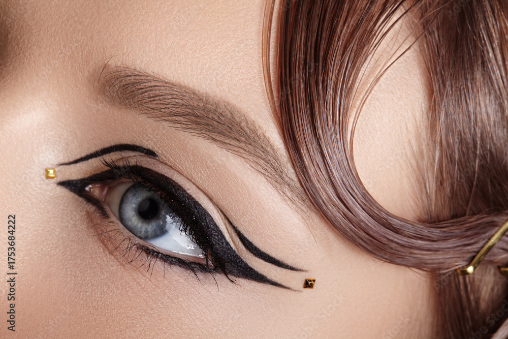 Artistic eye makeup featuring bold black winged eyeliner and small gold dots, emphasizing creativity and high-fashion beauty expression. Macro close-up Beauty for cosmetic brands, make-up artist