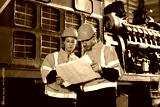 Engineers wearing safety helmets inspecting railway blueprint beside a vintage locomotive, symbolizing teamwork, innovation, and development in modern rail transportation and infrastructure projects