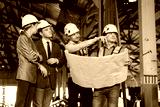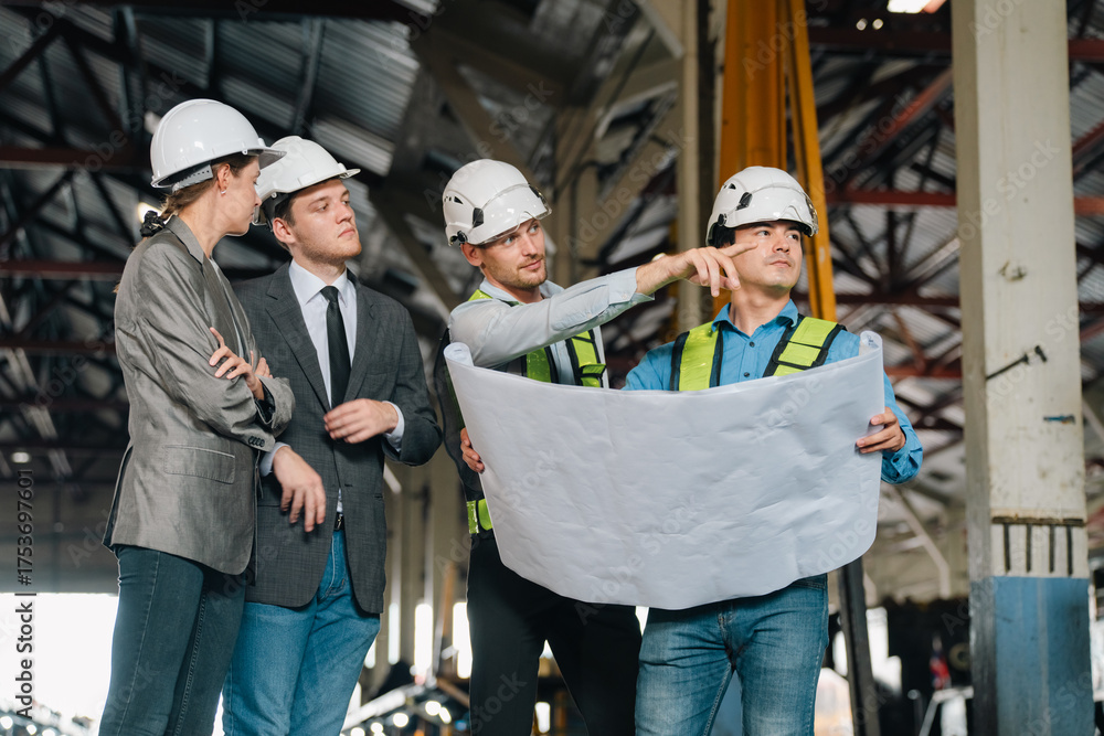 Engineers wearing safety helmets inspecting railway blueprint beside a vintage locomotive, symbolizing teamwork, innovation, and development in modern rail transportation and infrastructure projects
