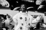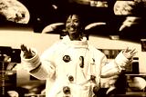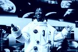 Cheerful astronaut analyzing Mars planetary data on displays in spacecraft powered by advanced engineering. Jolly starship cosmonaut exploring deep space, doing Martian surface research