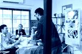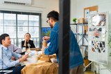 Corporate business team meeting discussion working plan in office room. Asian man employee writing on glass board presentation reusable Eco friendly product to colleague teamwork and project manager.