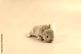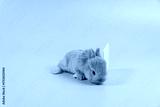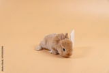 Adorable furry baby rabbit brown looking at laptop while sitting over isolated pastel background. Newborn bunny study information online with small pc with copy sapce. Animal education concept.