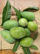Fresh green mangoes with leaves arranged on burlap fabric, showcasing tropical fruit in a natural rustic setting.