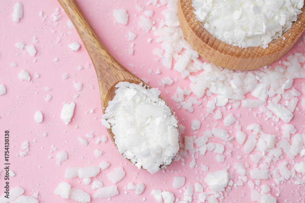 Wooden bowl and spoon with soy wax flakes on pastel pink background