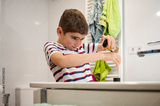 Concentrated young boy applying cologne to his arm in a modern home bathroom during daily grooming routine