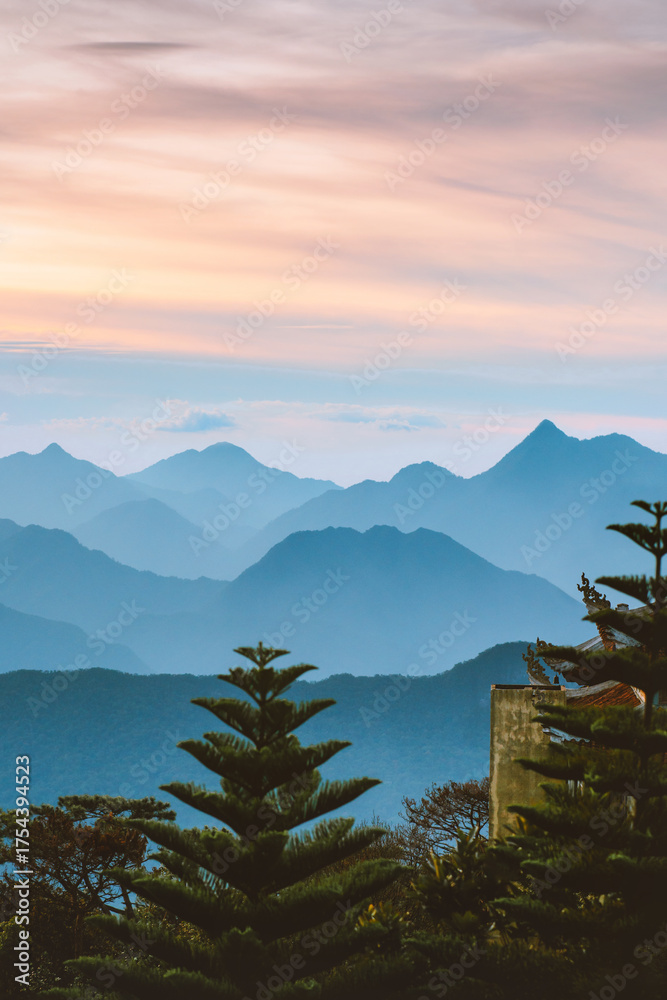 Vietnam landscape - sunset mountains range layers and pine trees forest in Da nang resort, southeast Asia travel destinations tranquil scenery