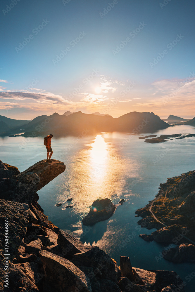 Man tourist discovery Norway solo standing on Torsketunga cliff edge travel in Lofoten islands climbing mountains above sea, extreme adventure tour hiking summer vacations outdoor freedom exploration