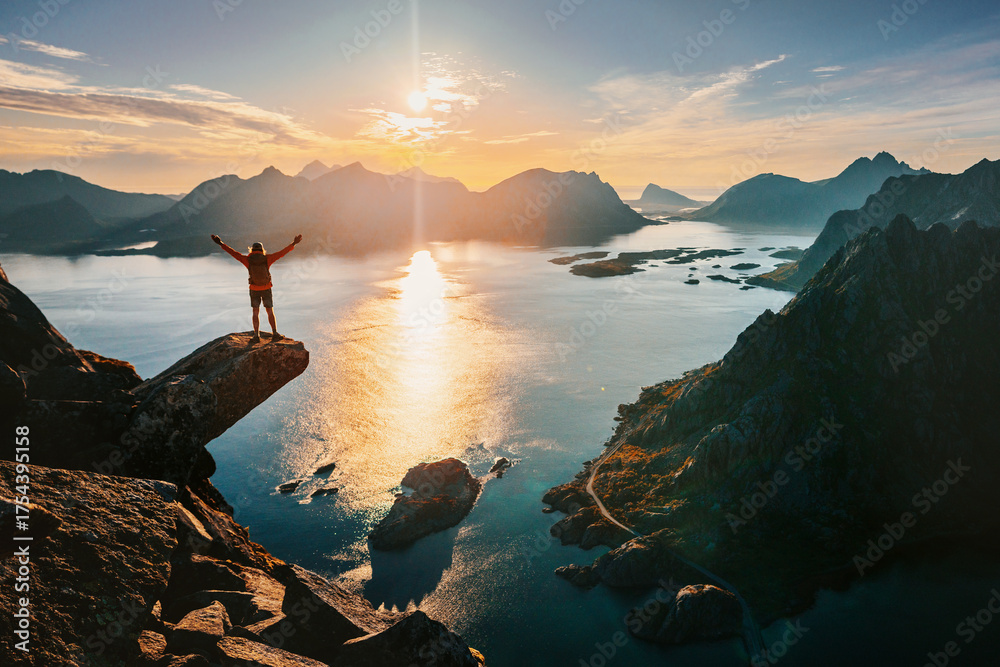 Man climber travel in Norway standing on Torsketunga cliff edge in Lofoten islands enjoying sunset mountains and sea view, extreme adventure trip in the wild outdoor freedom success concept