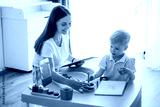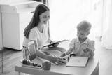 Playing with toys, motor skills. Speech therapist is with young boy indoors