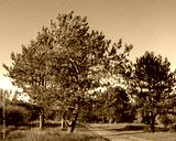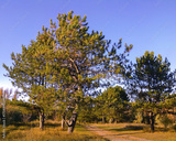 Breezy park vista with evergreen crowns and endless blue sky