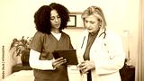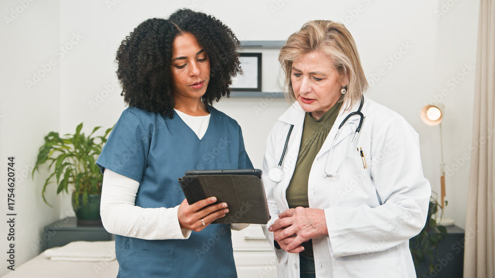 Nurse And Doctor Review Tablet Data Together In Clinic Office Setting