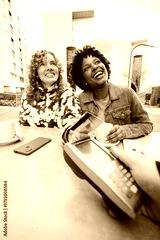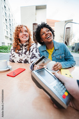 Two joyful women are engaged in a delightful conversation as they proceed to make a payment at a cafe, showcasing excitement and connection during the transaction process.