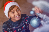 Happy Caucasian cute preteen boy decorating the Christmas tree at home. Son grandson kid child doing ornaments for fir tree. Happy New Year! Winter holidays spirit