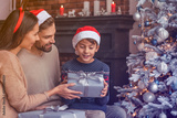 Parents giving present their son while sitting near Christmas tree in living room. Family reunion for New Year. Young caucasian parents sharing gift boxed with kid child for winter holiday