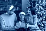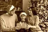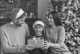 Caucasian parents and their little son in santa hats spending time together near the Christmas tree. Family celebration for winter holidays and New Year. Present gift sharing giving concept