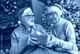 Happy senior couple in Santa hats exchanging Christmas gifts at home. Elderly old grandparents spouses grandfather and grandmother sharing giving presents