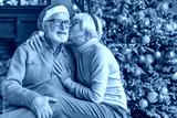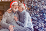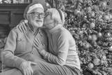 Senior couple celebrating christmas at home and elderly woman kissing her husband. Old spouses grandparents embracing hugging cuddling together for New Year celebration