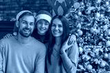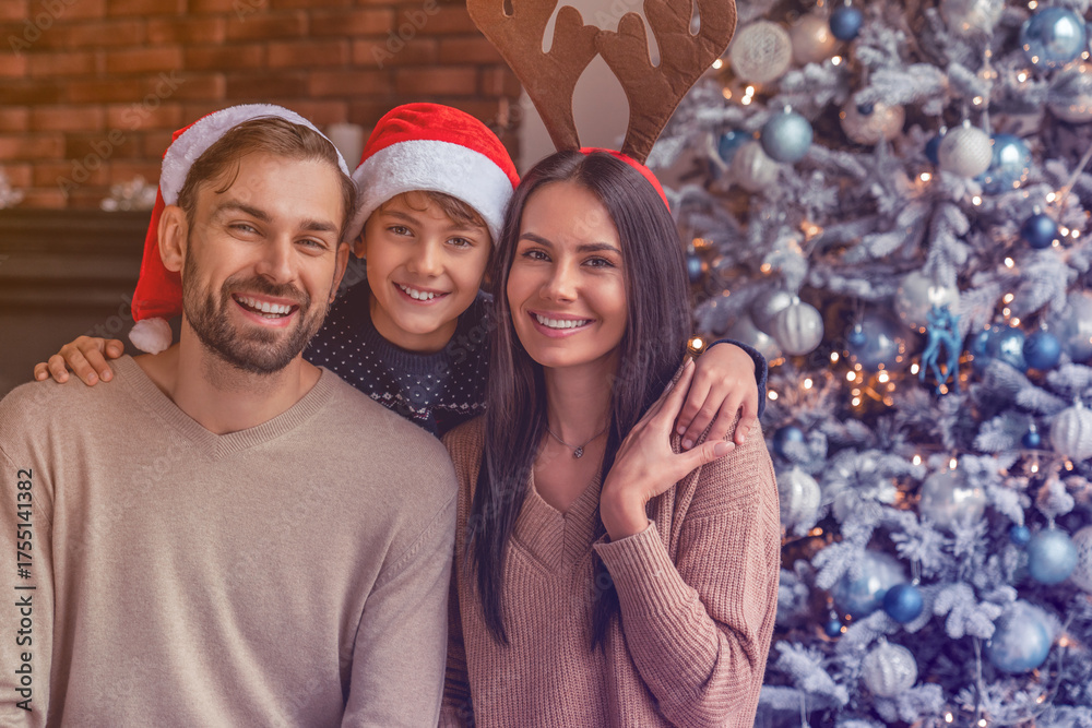 Portrait of happy family celebrating Christmas together at home. Parents and son kid child hugging embracing looking at the camera. Happy New Year Eve!