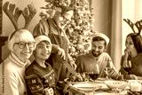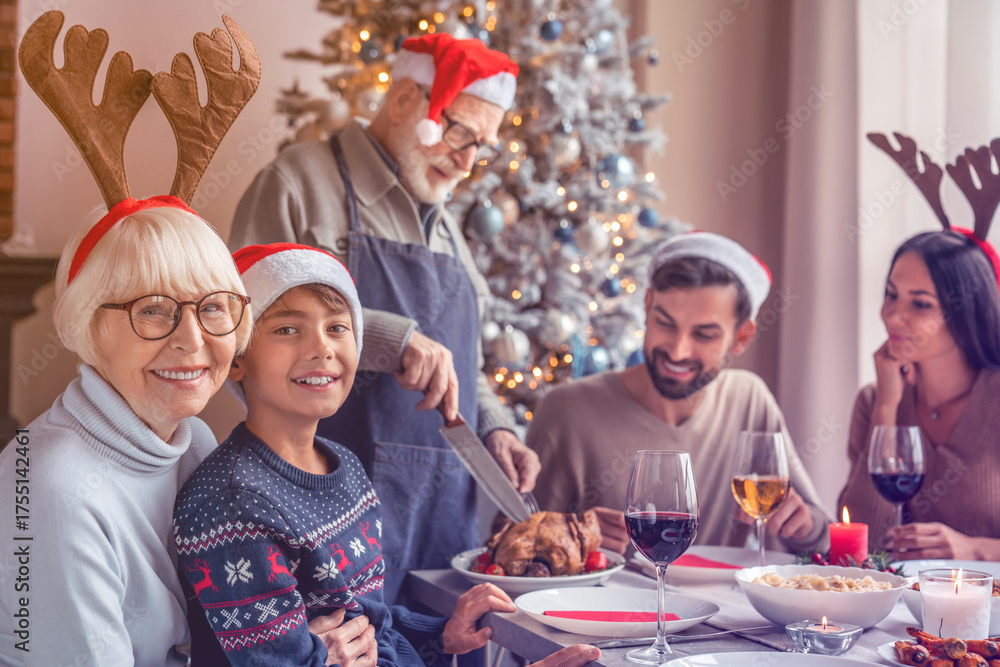 Family together at Christmas dinner at home. Happy three generation family looking at the camera celebrating New Year together dining at festive table. Nutrition food for party, thanksgiving tradition