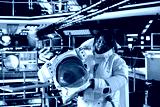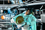 Jolly astronaut analyzing Mars planetary data in spacecraft powered by advanced engineering. Upbeat starship crew member exploring deep space, doing Martian surface research