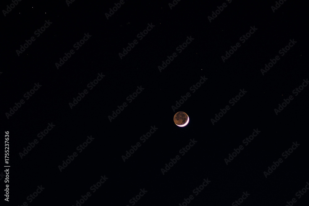 Night sky with moon. Detailed crescent moon with illuminated edge and surface