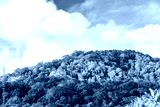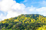 Tropical mountain jungle forest trees plants clouds blue sky Thailand.