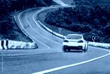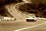 Luxury white car driving fast on a wet, winding mountain road after the rain. Dynamic travel and road trip concept through lush green tropical forest.