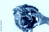 Male hands wash their hair with shampoo and foam on blue background close-up.