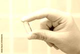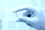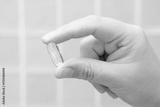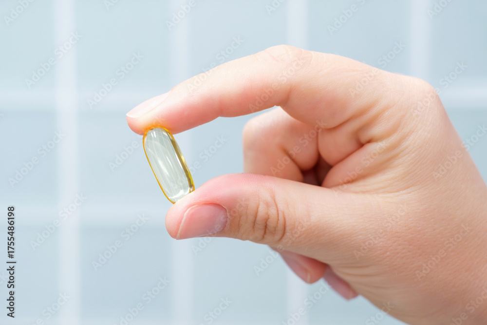 A hand holds a yellow fish oil capsule against a blue tile background, close-up.