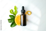 Amber glass dropper bottle with orange slice, citrus peel, and green leaves on white background. Perfect for beauty product advertisements, wellness, or natural cosmetic branding visuals