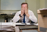 Caucasian middle aged man sitting at desk covering face with hands showing stress or frustration surrounded by paperwork and office supplies in business environment