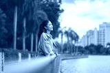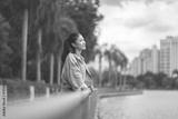 Beautiful Asian woman relaxing by riverside in city park, smiling female enjoying fresh air and peaceful moment, lifestyle and wellness concept with nature, freedom and happiness in urban environment
