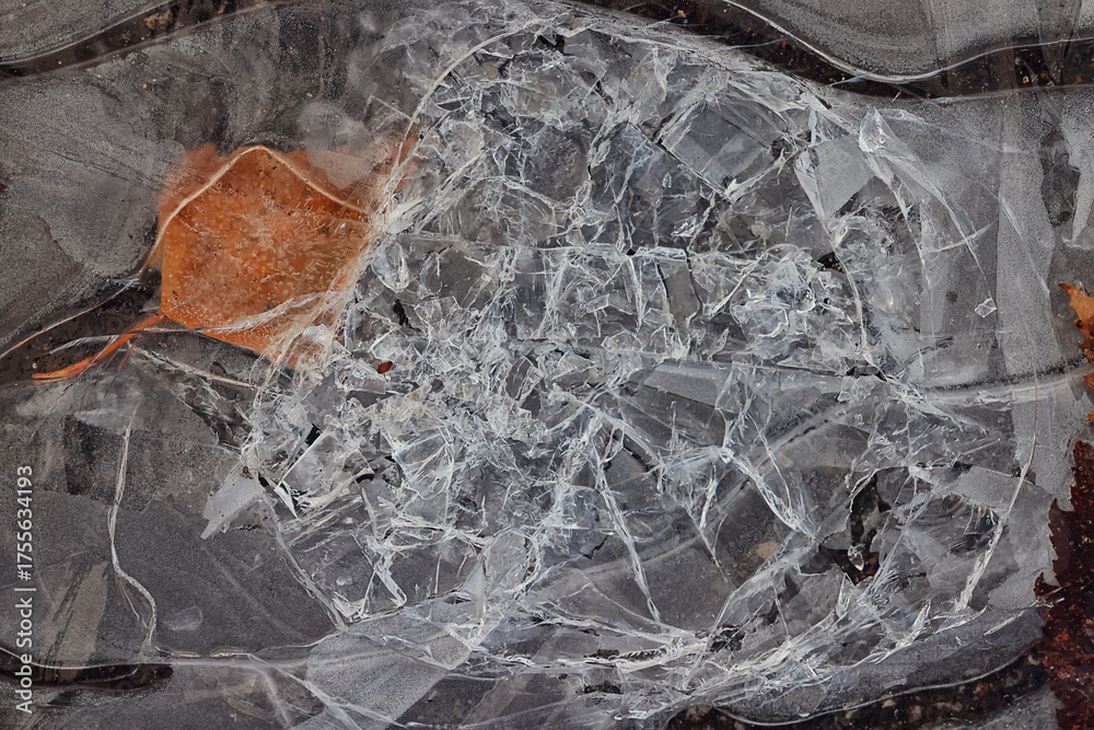 autumn fallen leaves frozen in ice, seasonal background, texture of autumn and early winter