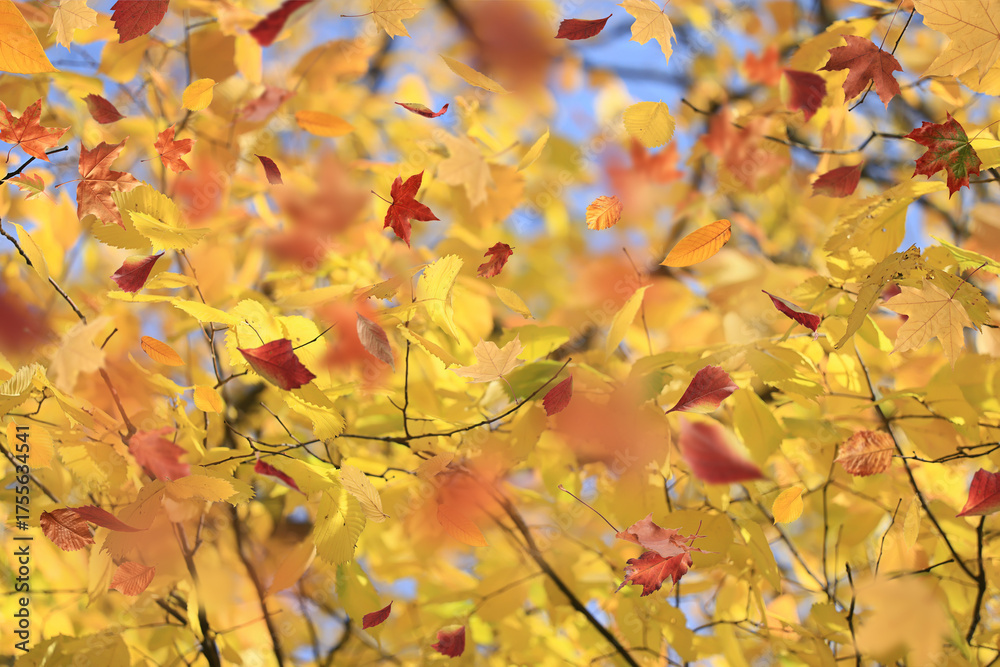 Leaf fall landscape in autumn park, colorful leaves flying in the wind background of October