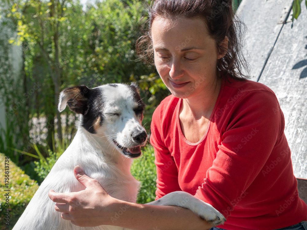 Friendship and togetherness. Family portrait of woman and pet dog outdoor. Pet companion for woman. Dog companion. Girl and canine friend. Leisure and bonding concept. Friendship