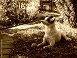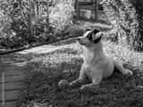 Canine training. Dog activity on grass with ball, copy space. Puppy pet play outdoor. Happy dog playing with pet toy. Playful happy pet dog playing. Puppy training banner. Dog adoption