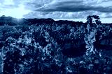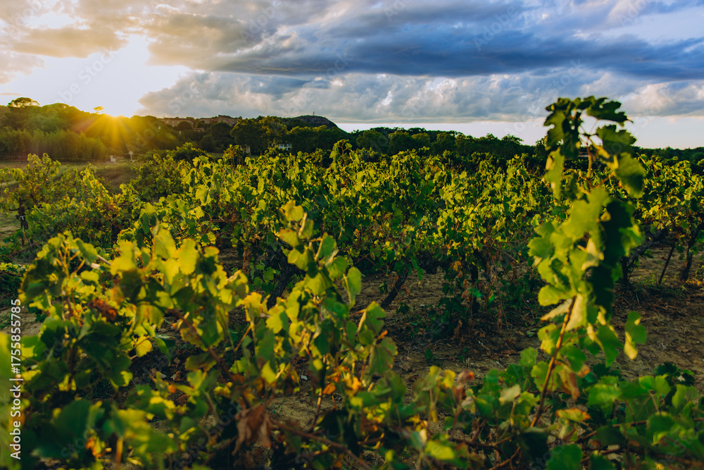 Young grapevine plant in vineyard at golden sunset. Vibrant green leaves glowing in warm light. Organic agriculture and winemaking concept