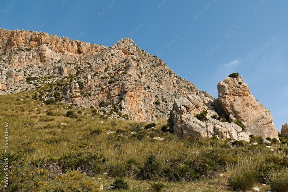 View of the limestone massif of Mont Cofano on Sicily island. Italy. Europe.