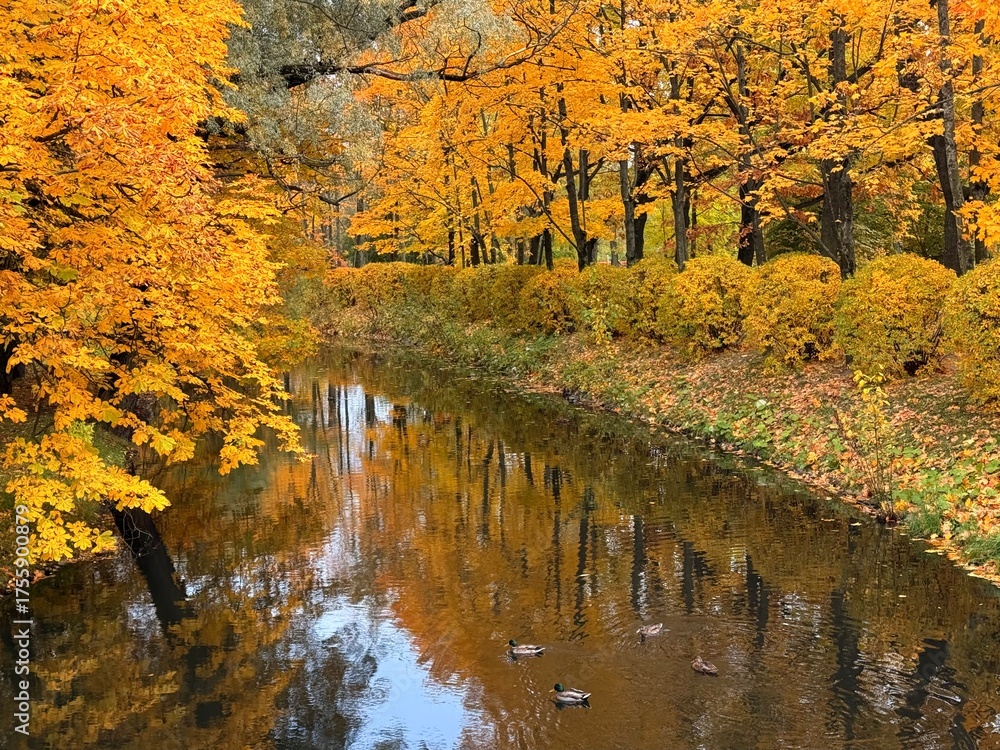 colorful autumn trees reflection on the pond in the park, golden fall. impressive vivid colors of the fall