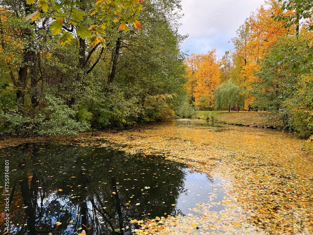 colorful autumn trees reflection on the pond in the park, golden fall. impressive vivid colors of the fall