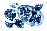 Top view of fresh ripe pomegranate and pieces on plate for eating, top view.