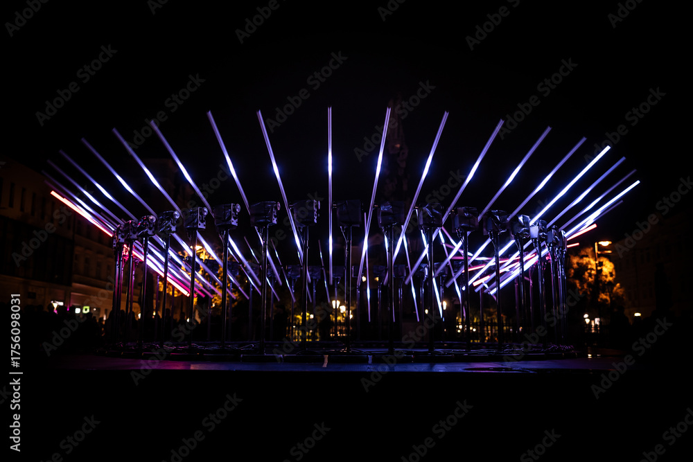 The fascinating night scene captures a modern light installation that dominates the space with a futuristic aesthetic and consists of a number of diagonally arranged led tubes in a circular formation.