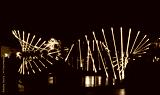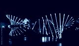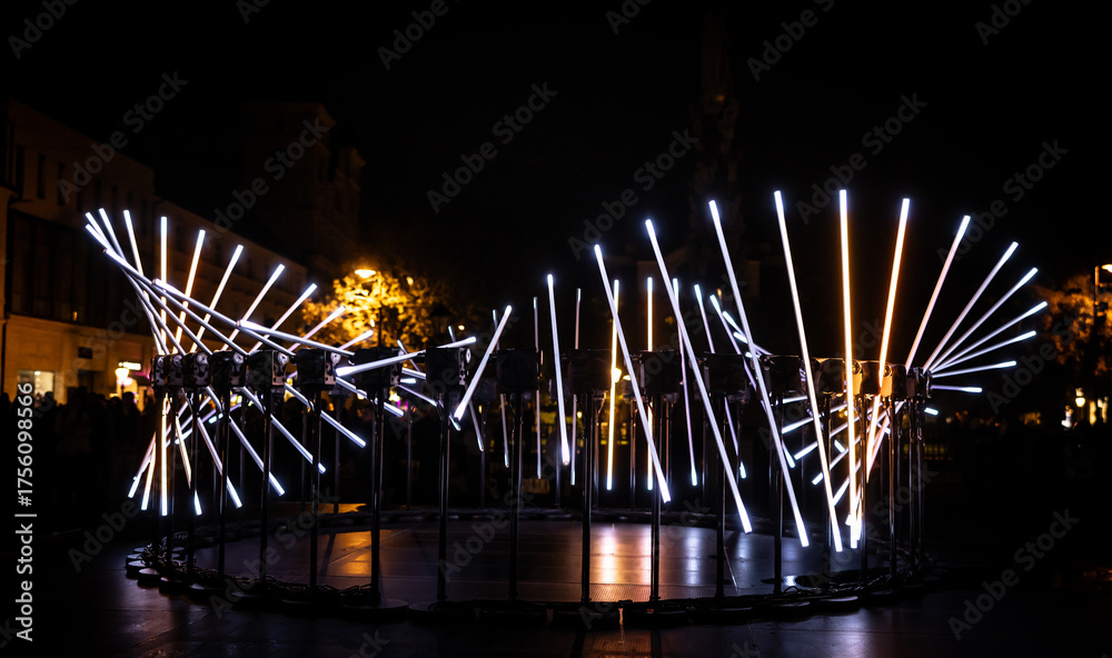 The fascinating night scene captures a modern light installation that dominates the space with a futuristic aesthetic and consists of a number of diagonally arranged led tubes in a circular formation.