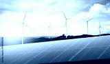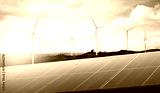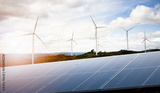 Wind turbines and Solar panels park at sunset.Windmill turbines generating green energy electric.Green energy reduce carbon emissions and makes earth cleaner and more ecological.