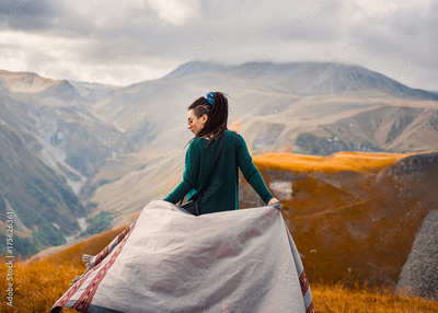 portrait of a young beautiful hipster girl in sunglasses with hair dreadlock in a boho gypsy hippie style clothes on a background of cloudy sky and autumn mountains of Georgia dancing