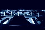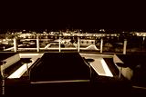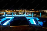 Evening view from outdoor deck swimming pools on a cruise ship of the illuminated walls, marina, old town and castle along the port of Rhodes, Greece.