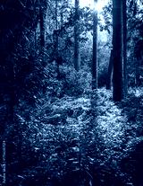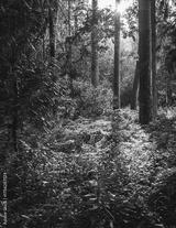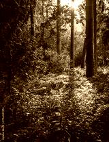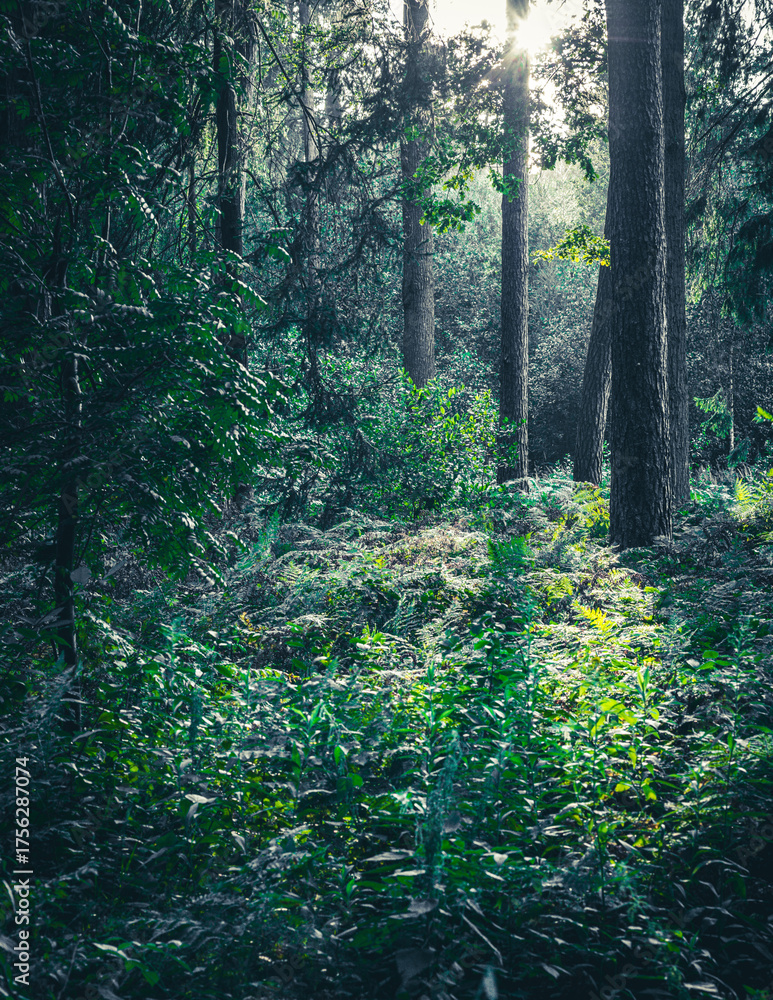 piękny las oświetlony promieniami słońca z paprociami i grzybami