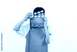 young casual dressed Generation Z influencer white male model teenage boy prepares to create and direct social media film reel with blank clapperboard slate. plain background studio setting