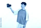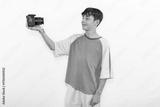 young casual dressed Generation Z white male model teenage boy selfie photo with DSLR camera. happy smile expressing joy in positive happy way in plain background studio setting